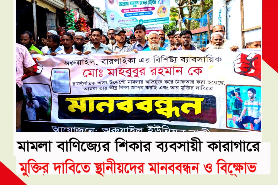 মামলা বাণিজ্যের শিকার ব্যবসায়ী কারাগারে, মুক্তির দাবিতে স্থানীয়দের মানববন্ধন ও বিক্ষোভ