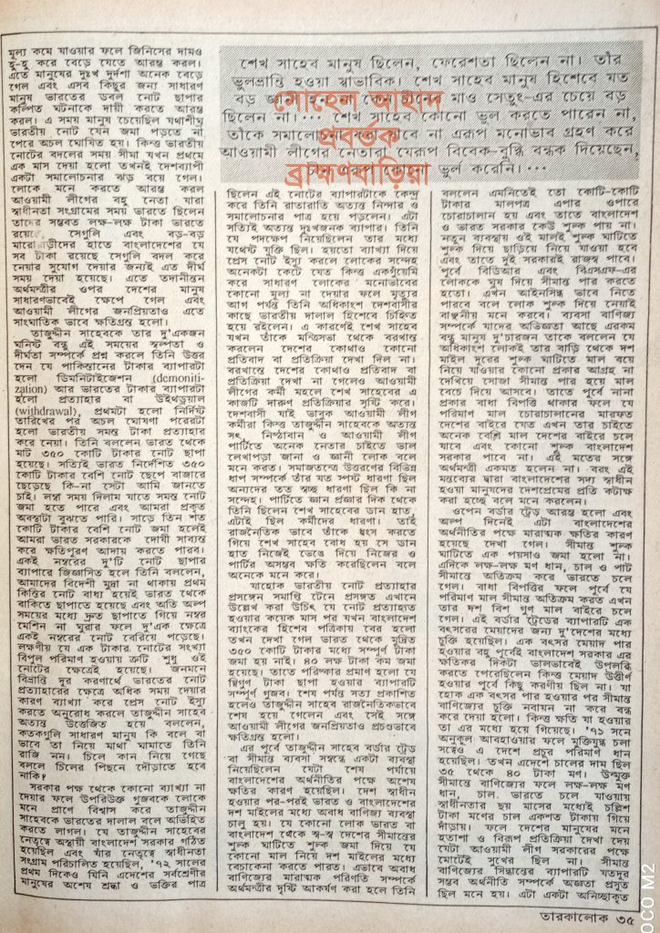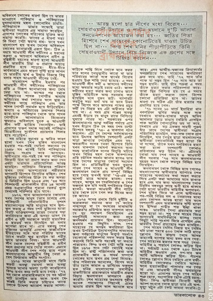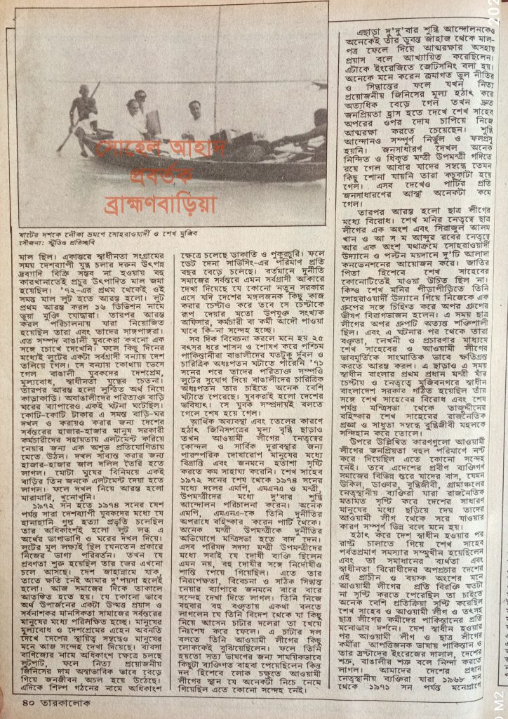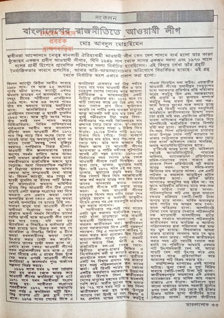 ১৯৮৯ সনে পাক্ষিক ম্যাগাজিন “তারকালোক”এ আওয়ামী লীগের প্রবীন নেতা মো. আবদুল মোহাইমেন’র লেখা থেকে চুম্বকাংশ তুলে ধরা হয়েছে।