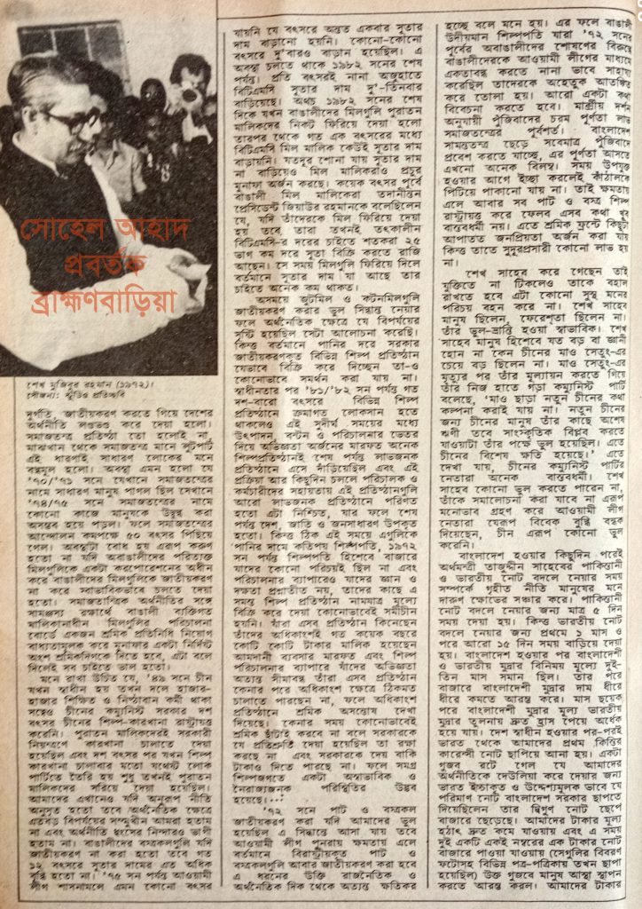 সে সময় মিলগুলি ফিরিয়ে দিলে বর্তমানে সুতার দাম যা আছে তার চাইতে অনেক কম থাকত। অসময়ে জুটমিল ও কটনমিলগুলি জাতীয়করণ করার ভুল সিদ্ধান্ত নেয়ার ফলে অর্থনৈতিক ক্ষেত্রে যে বিপর্যয়ের সৃষ্টি হয়েছিল সেটা আলোচনা করেছি। কিন্তু বর্তমানে পানির দরে সরকার জাতীয়করণকৃত বিভিন্ন শিল্প প্রতিষ্ঠান যেভাবে বিক্রি করে দিচ্ছেন তা-ও কোনভাবে সমর্থন করা যায় না। স্বাধীনতার পর “৮১/৮২” সন পর্যন্ত গত দশ-বারো বছর বৎসরে বিভিন্ন শিল্প প্রতিষ্ঠানে ক্রমাগত লোকসান হতে থাকলেও এই সুদীর্ঘ সময়ের মধ্যে উৎপাদন বণ্টন ও পরিচালনার ভেতর দিয়ে অভিজ্ঞতা অর্জনের মারফত অনেক শিল্প-প্রতিষ্ঠানই শেষ পর্যন্ত লাভজনক প্রতিষ্ঠানে এসে দাঁড়িয়েছিল এবং এই প্রক্রিয়া আর কিছুদিন চললে পরিচালক ও কর্মচারীদের সহায়তায় এই প্রতিষ্ঠানগুলি আরো লাভজনক প্রতিষ্ঠানে পরিণত হতো এটা নিশ্চিত যার ফলে শেষ পর্যন্ত দেশ, জাতি ও জনসাধারণ উপকৃত হতো।