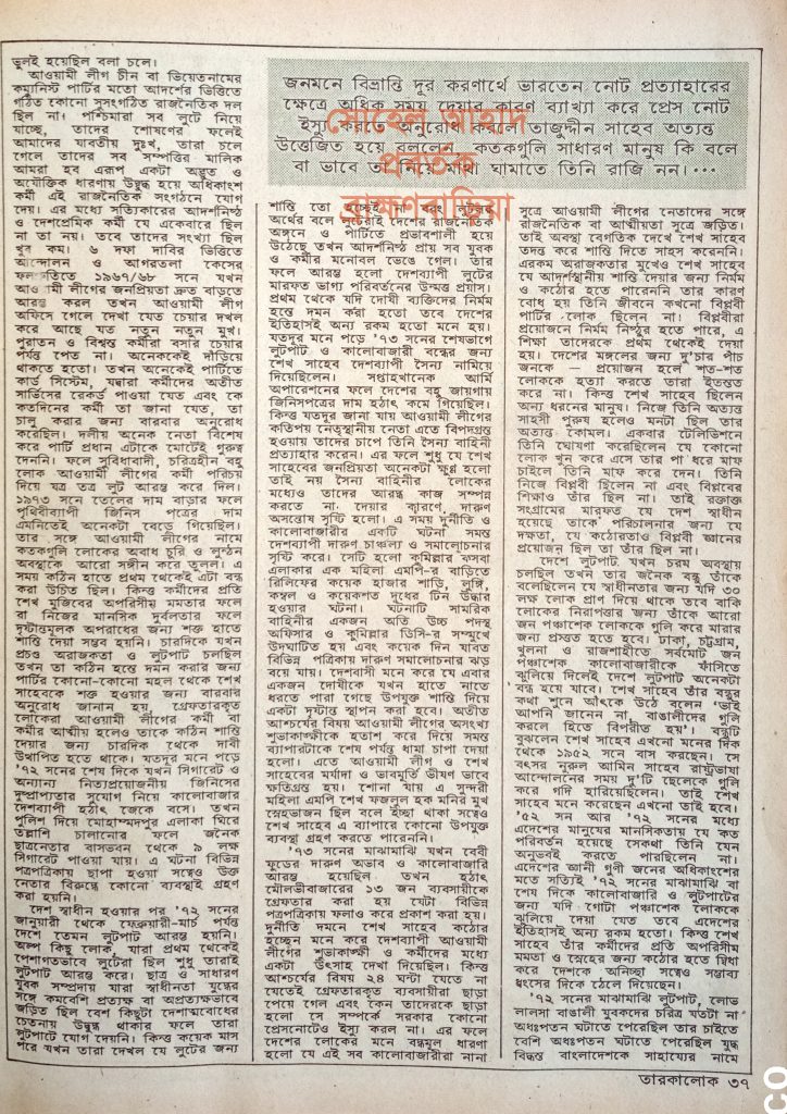 সরকার পক্ষ থেকে কোনো ব্যাখ্যা না দেয়ার ফলে উপরিউক্ত গুজবকে লোকে মনে প্রাণে বিশ্বাস করে তাজুদ্দীন সাহেবকে ভারতের দালাল বলে অভিহিত করতে লাগল। যে তাজুদ্দীন সাহেবের নেতৃত্বে অস্থায়ী বাংলাদেশ সরকার গঠিত হয়েছিল এবং যাঁর নেতৃত্বে স্বাধীনতা সংগ্রাম পরিচালিত হয়েছিল, ‘৭২ সালে প্রথম দিকেও যিনি এদেশের সর্বশ্রেণির মানুষের অশেষ শ্রদ্ধা ও ভক্তির পাত্র (শেখ সাহেব মানুষ ছিলেন, ফেরেশতা ছিলেন না। তাঁর ভুলভ্রান্তি হওয়া স্বাভাবিক। শেখ সাহেব মানুষ হিসেবে যত বড় জ্ঞানী হন না কেন চীনের মাও সেতুং-এর চেয়ে বড় ছিলেন না। শেখ সাহেব কোনো ভুল করতে পারেন না, তাঁকে সমালোচনা করা যাবে না এরূপ মনোভাব গ্রহণ করে আওয়ামী লীগের নেতারা যেরূপ বিবেক-বুদ্ধি বন্ধক দিয়েছেন, চীন এরূপ কোনো ভুল করেনি।)
