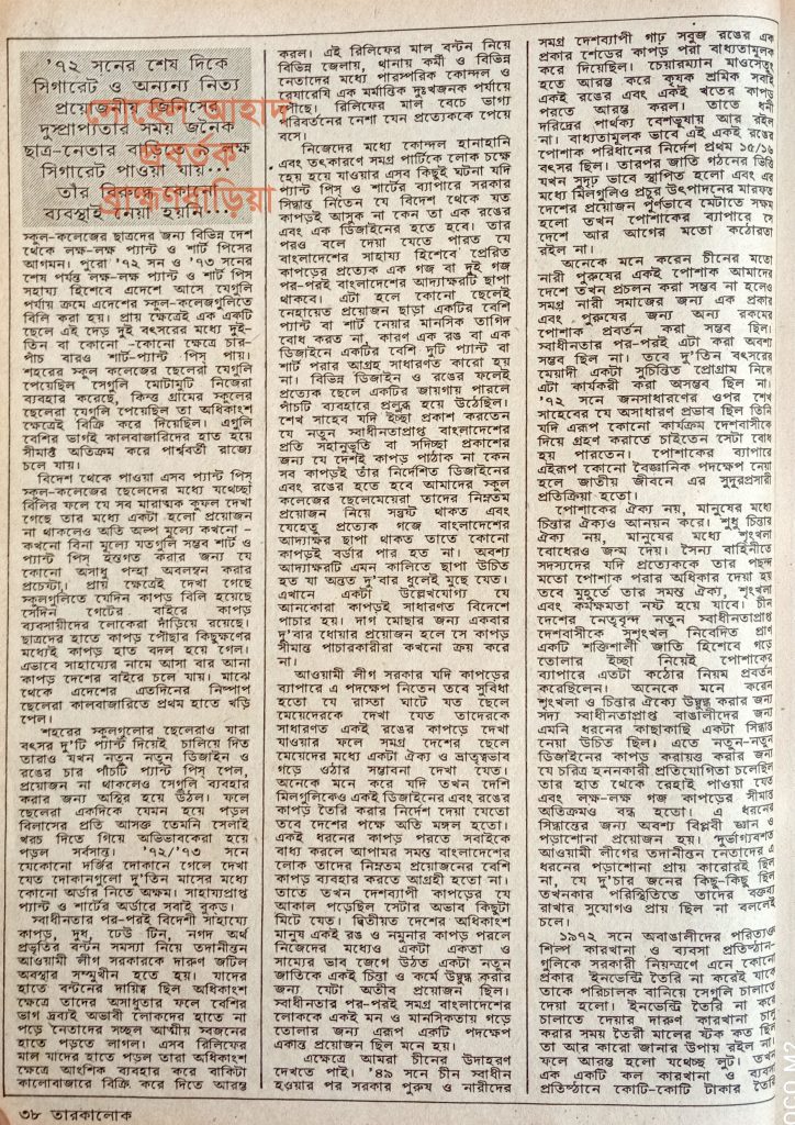 ‘৭২ সনের মাঝামাঝি লুটপাট, লোভ লালসা বাঙালি যুবকদের চরিত্র যতটা না অধঃপতন ঘটাতে পেরেছিল তার চাইতে বেশি অধঃপতন ঘটাতে পেরেছিল যুদ্ধ বিদ্ধস্ত বাংলাদেশকে সাহায্যের নামে স্কুল-কলেজের ছাত্রদের জন্য বিভিন্ন দেশ থেকে লক্ষ-লক্ষ প্যান্ট ও শার্ট পিস সাহায্য হিসেবে এদেশে আসে যেগুলি পর্যায়ক্রমে এদেশের স্কুল-কলেজগুলিতে বিলি করা হয়।