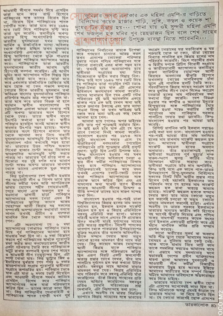 পাকিস্তান ভেঙে যাক এটা যারা ৬ দফায় ভেটো দিয়েছিল এবং আওয়ামী লীগকে সমর্থন জানিয়ে এসেছিল, বিশেষ করে পাকিস্তান আন্দোলনের সঙ্গে যারা সক্রিয়ভাবে জড়িত-তাদের কারো কাম্য ছিল না। কিন্তু পাকিস্তানীর সেনাবাহিনী ও পাকিস্তানের শাসক গোষ্ঠী যখন পূর্ব (কুমিল্লার কসবা এলাকার এক মহিলা এমপি-র বাড়িতে রিলিফের কয়েক হাজার শাড়ি, লুঙ্গি, কম্বল ও কয়েকশ’ দুধের টিন উদ্ধার হয়…।
