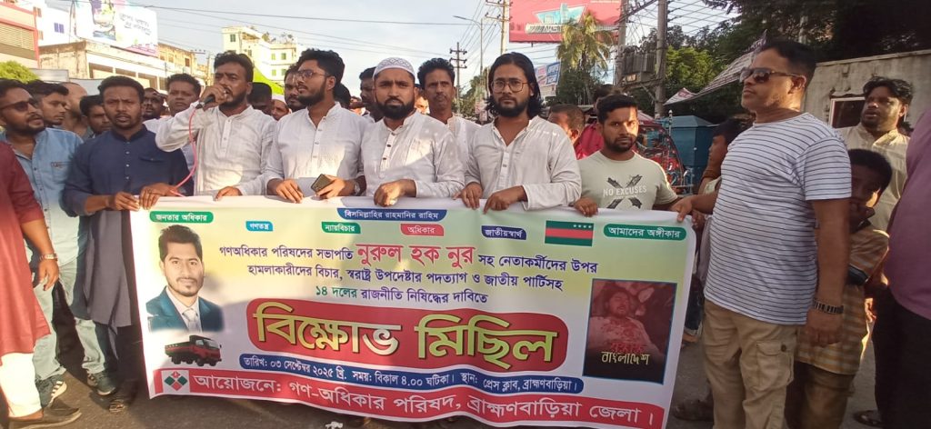 আমার ব্রাহ্মণবাড়িয়া: ব্রাহ্মণবাড়িয়ায় ভিপি নুরুল হক নুরের ওপর হামলার প্রতিবাদে বিক্ষোভ মিছিল ও প্রতিবাদ সমাবেশ করেছে ব্রাহ্মণবাড়িয়া গণ-অধিকার পরিষদ।