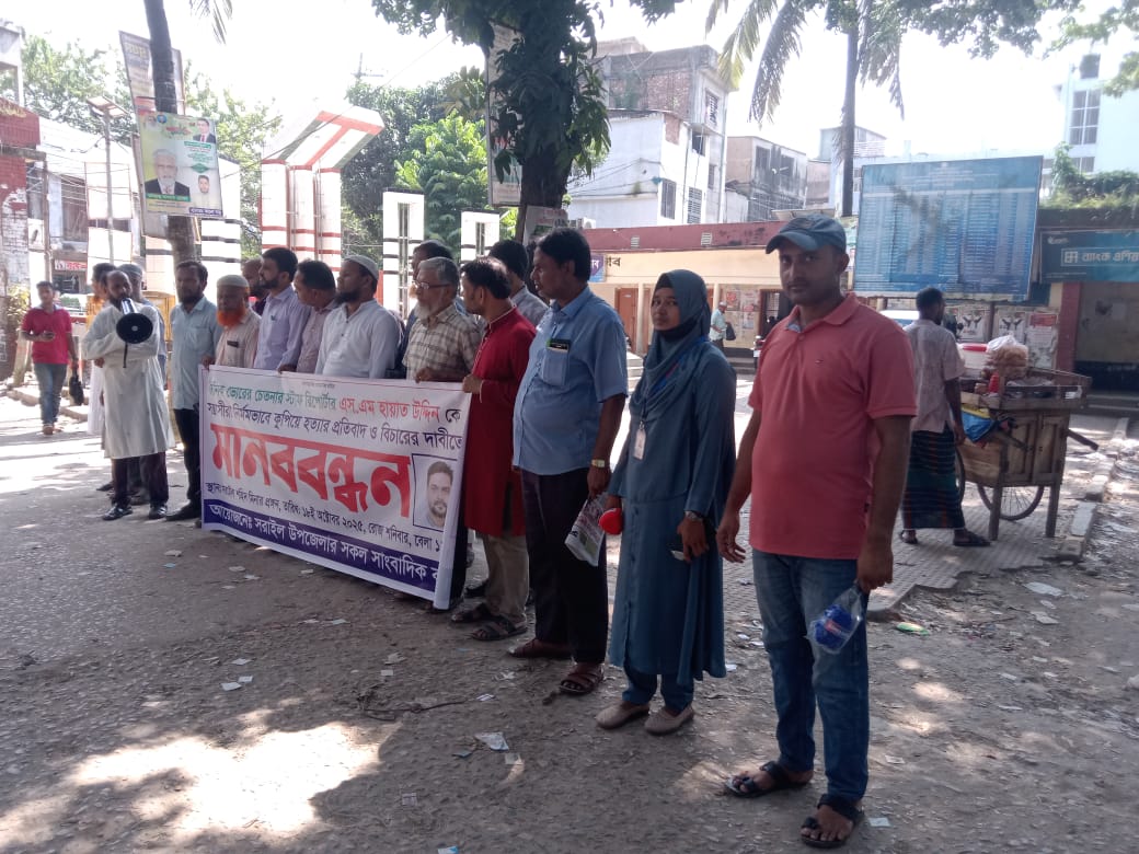 সরাইল (ব্রাহ্মণবাড়িয়া) প্রতিনিধিঃ ব্রাহ্মণবাড়িয়া সরাইলে বাগেরহাটে কর্মরত দৈনিক ভোরের চেতনা পত্রিকার স্টাফ রিপোর্টার এস. এম. হায়াত উদ্দিনকে নির্মমভাবে কুপিয়ে হত্যার প্রতিবাদে এবং দ্রুত বিচার দাবিতে মানববন্ধন অনুষ্ঠিত হয়েছে।