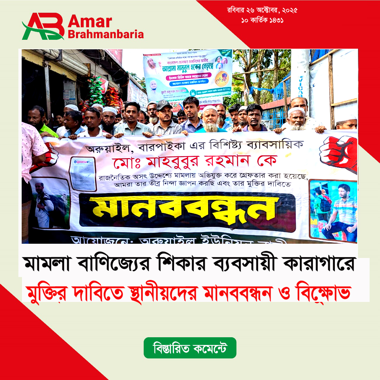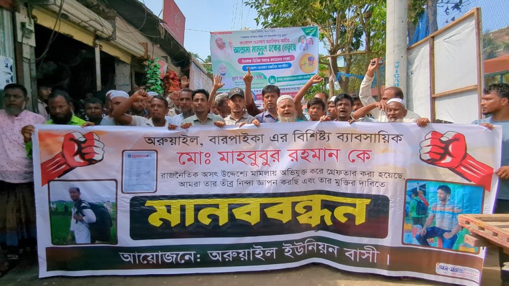 ব্রাহ্মণবাড়িয়া প্রতিনিধিঃ ব্রাহ্মণবাড়িয়ার সরাইল উপজেলার অরুয়াইল বাজারের ব্যবসায়ী মাহবুবুর রহমানের নিঃশর্ত মুক্তির দাবিতে মানববন্ধন ও বিক্ষোভ অনুষ্ঠিত হয়েছে।